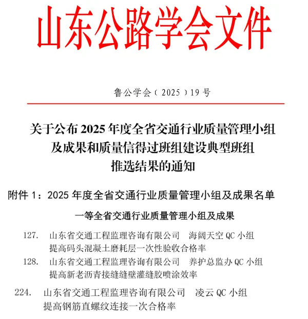 近日,在山東公路學會組織的“2025年度全省交通行業質量管理小組”和濟南市質量管理協會組織的“濟南市2025年度群眾性質量管理活動優秀成果”活動中,公司海闊天空QC小組、養護總監辦QC小組、凌云QC小組相繼榮獲“全省交通行業質量管理小組”和“優秀質量管理小組成果”榮譽稱號。